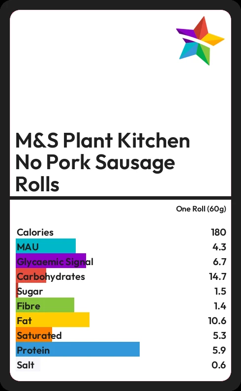 M&S Plant Kitchen No Pork Sausage Rolls contains 180 calories in one Roll (60g).