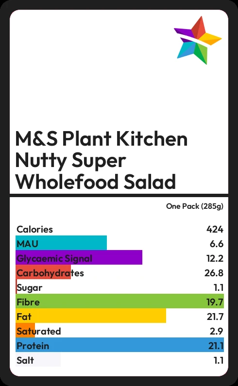 M&S Plant Kitchen Nutty Super Wholefood Salad contains 424.7 calories in one Pack (285g).