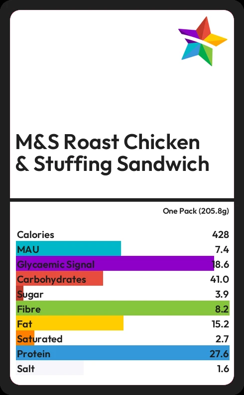 M&S Roast Chicken & Stuffing Sandwich contains 428.1 calories in one Pack (205.8g).