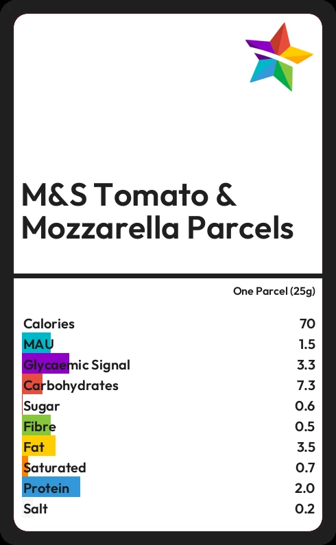 M&S Tomato & Mozzarella Parcels contains 69.8 calories in one Parcel (25g).