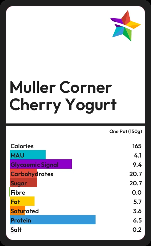 Muller Corner Cherry Yogurt contains 20.7g sugar in one Pot (150g) - that is around 5 cubes of sugar.
