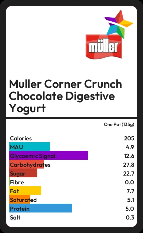 Muller Corner Crunch Chocolate Digestive Yogurt contains 22.7g sugar in one Pot (135g) - that is around 6 cubes of sugar.