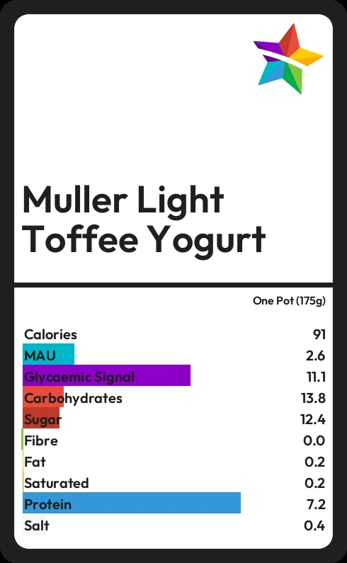 Muller Light Toffee Yogurt contains 12.4g sugar in one Pot (175g) - that is around 3 cubes of sugar.