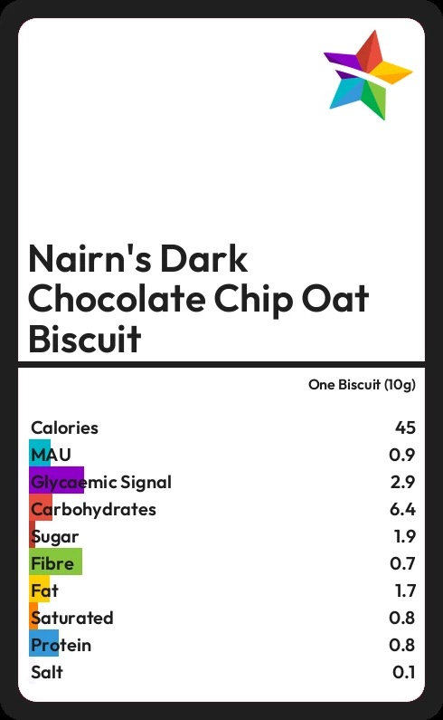 Nairn's Dark Chocolate Chip Oat Biscuit contains 1.9g sugar in one Biscuit (10g)
