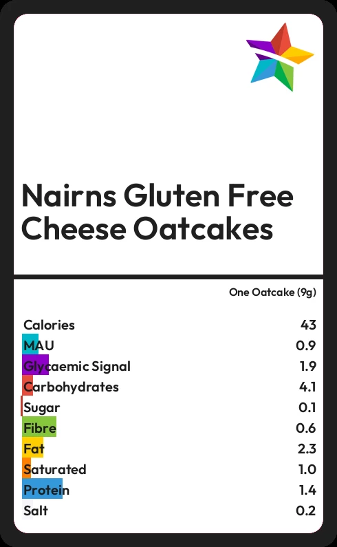 Nairns Gluten Free Cheese Oatcakes contains 0.1g sugar in one Oatcake (9g)