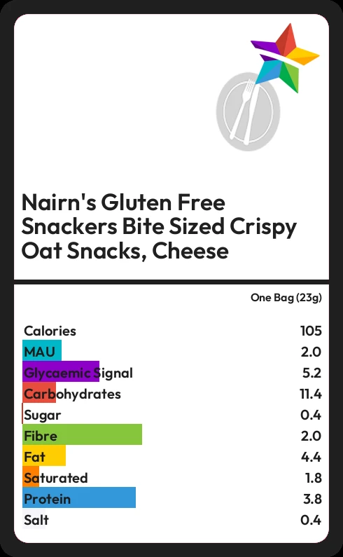 Nairn's Gluten Free Snackers Bite Sized Crispy Oat Snacks, Cheese contains 105 calories in one Bag (23g).