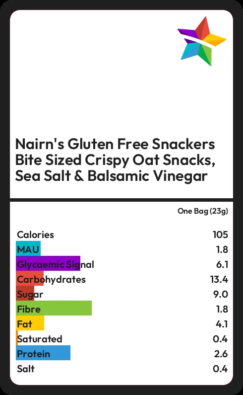 Nairn's Gluten Free Snackers Bite Sized Crispy Oat Snacks, Sea Salt & Balsamic Vinegar contains 9.0g sugar in one Bag (23g) - that is around 2 cubes of sugar.