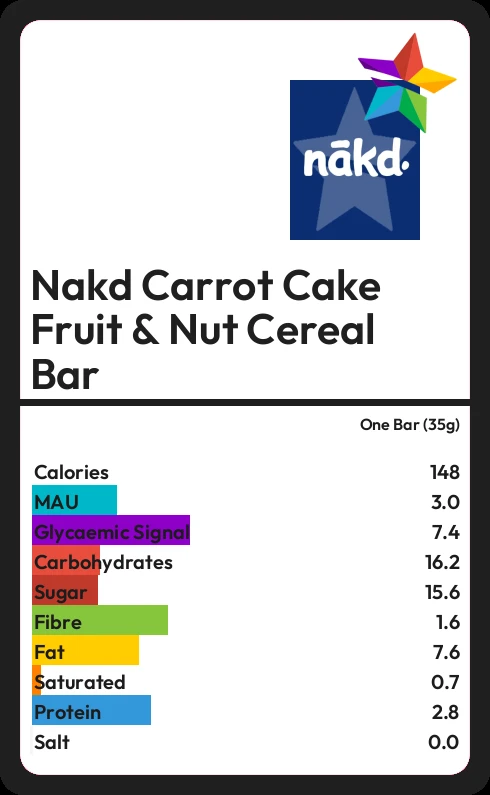 Nakd Carrot Cake Fruit & Nut Cereal Bar contains 15.6g sugar in one Bar (35g) - that is around 4 cubes of sugar.