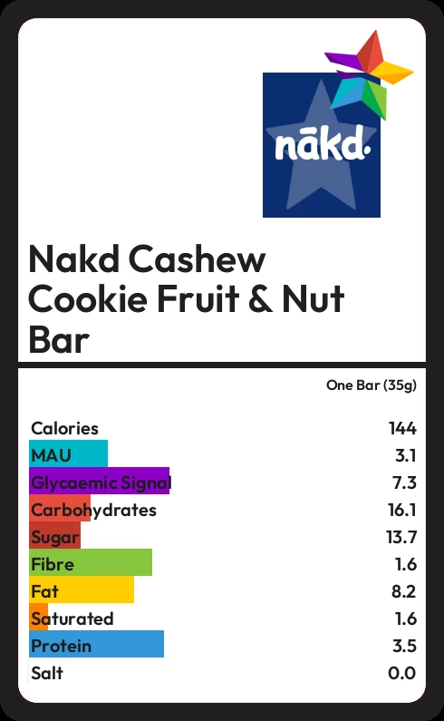Nakd Cashew Cookie Fruit & Nut Bar contains 144.2 calories in one Bar (35g).