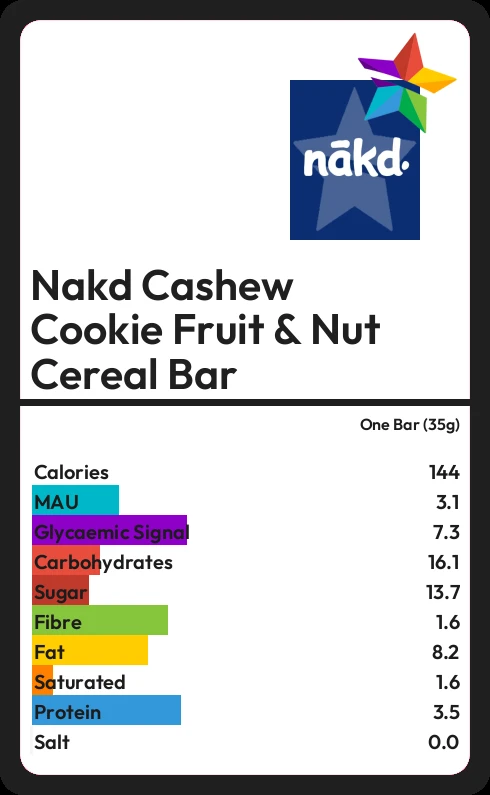 Nakd Cashew Cookie Fruit & Nut Cereal Bar contains 144.2 calories in one Bar (35g).