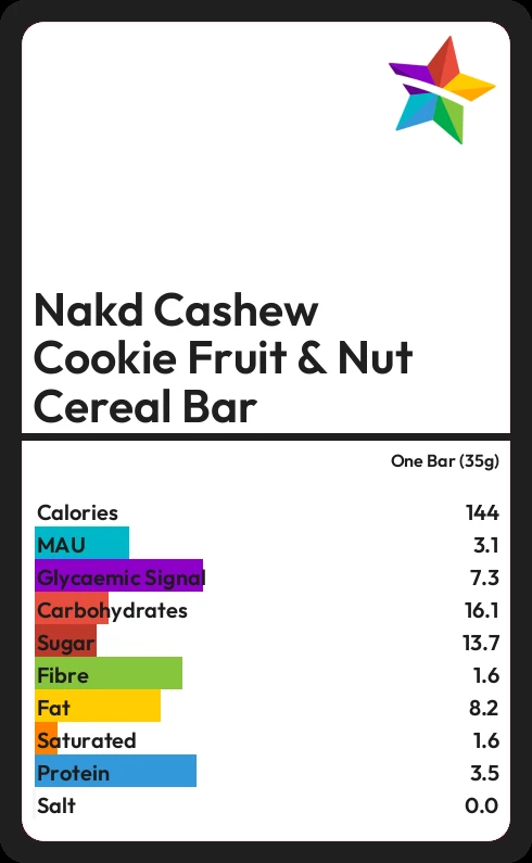 Nakd Cashew Cookie Fruit & Nut Cereal Bar contains 144.2 calories in one Bar (35g).