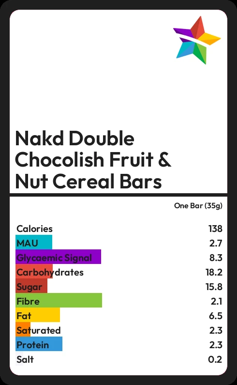 Nakd Double Chocolish Fruit & Nut Cereal Bars contains 15.8g sugar in one Bar (35g) - that is around 4 cubes of sugar.