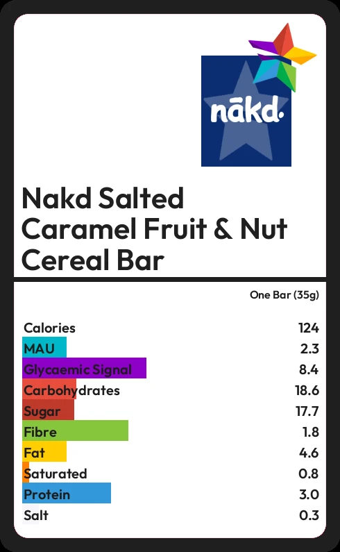 Nakd Salted Caramel Fruit & Nut Cereal Bar contains 17.7g sugar in one Bar (35g) - that is around 4 cubes of sugar.