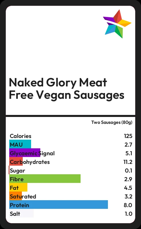 Naked Glory Meat Free Vegan Sausages contains 0.1g sugar in two Sausages (80g)