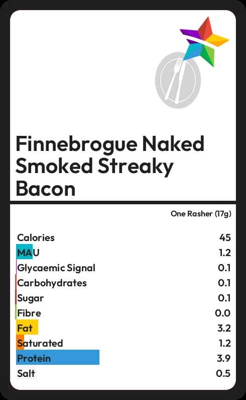 In one Rasher (17g) of Finnebrogue Naked Smoked Streaky Bacon there are 3.2g of fat of which 1.2g are saturated.