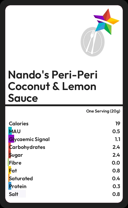 Nando's Peri-Peri Coconut & Lemon Sauce contains 19.2 calories in one Serving (20g).