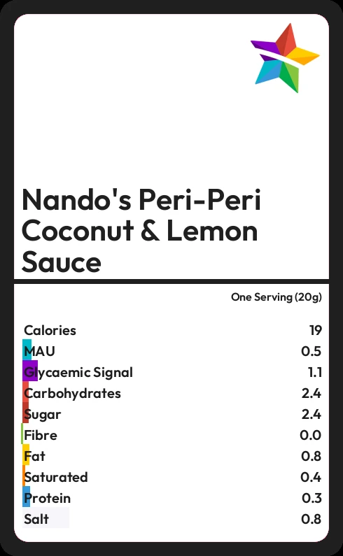Nando's Peri-Peri Coconut & Lemon Sauce contains 19.2 calories in one Serving (20g).