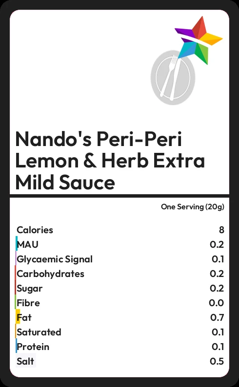 Nando's Peri-Peri Lemon & Herb Extra Mild Sauce contains 8.4 calories in one Serving (20g).