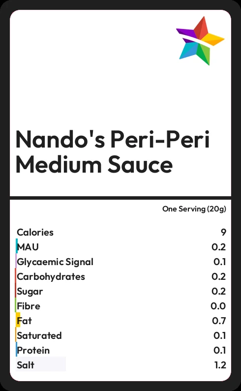 Nando's Peri-Peri Medium Sauce contains 0.2g sugar in one Serving (20g)