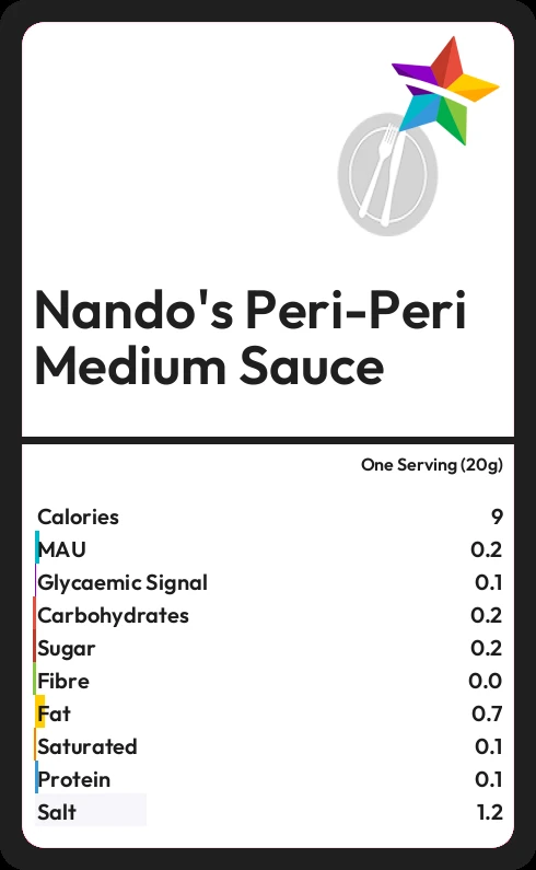 Nando's Peri-Peri Medium Sauce contains 0.2g sugar in one Serving (20g)