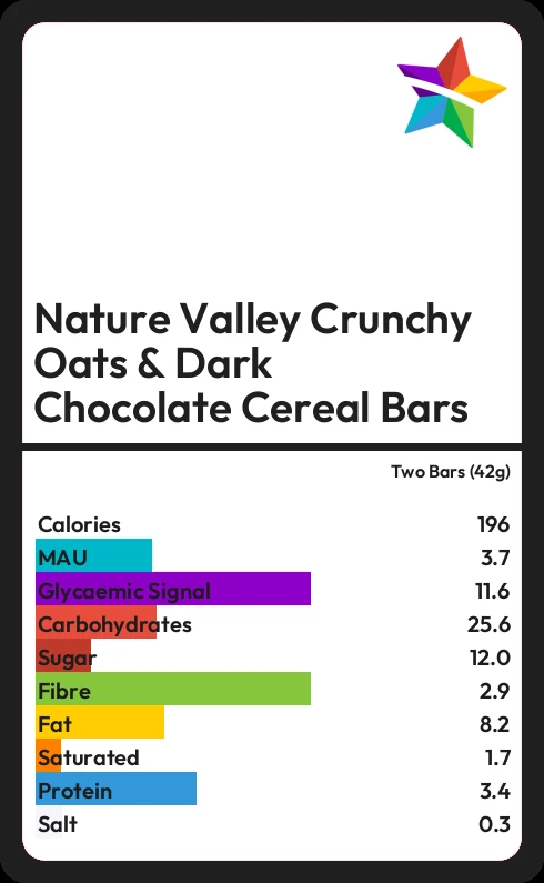 Nature Valley Crunchy Oats & Dark Chocolate Cereal Bars contains 12.0g sugar in two Bars (42g) - that is around 3 cubes of sugar.