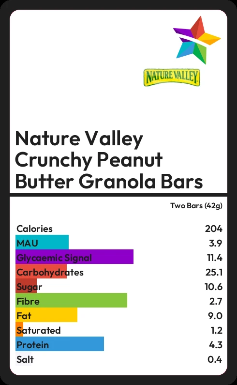 Nature Valley Crunchy Peanut Butter Granola Bars contains 10.6g sugar in two Bars (42g) - that is around 3 cubes of sugar.