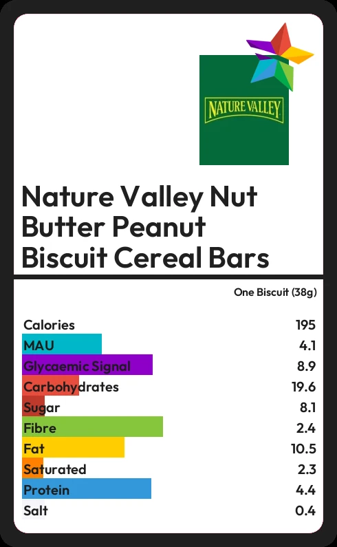Nature Valley Nut Butter Peanut Biscuit Cereal Bars contains 8.1g sugar in one Biscuit (38g) - that is around 2 cubes of sugar.