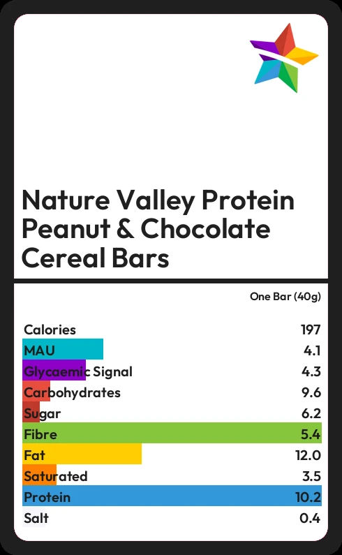 Nature Valley Protein Peanut & Chocolate Cereal Bars contains 6.2g sugar in one Bar (40g) - that is around 2 cubes of sugar.
