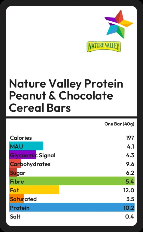 Nature Valley Protein Peanut & Chocolate Cereal Bars contains 6.2g sugar in one Bar (40g) - that is around 2 cubes of sugar.
