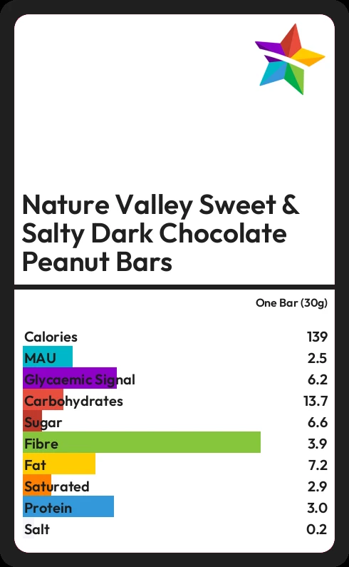 Nature Valley Sweet & Salty Dark Chocolate Peanut Bars contains 6.6g sugar in one Bar (30g) - that is around 2 cubes of sugar.