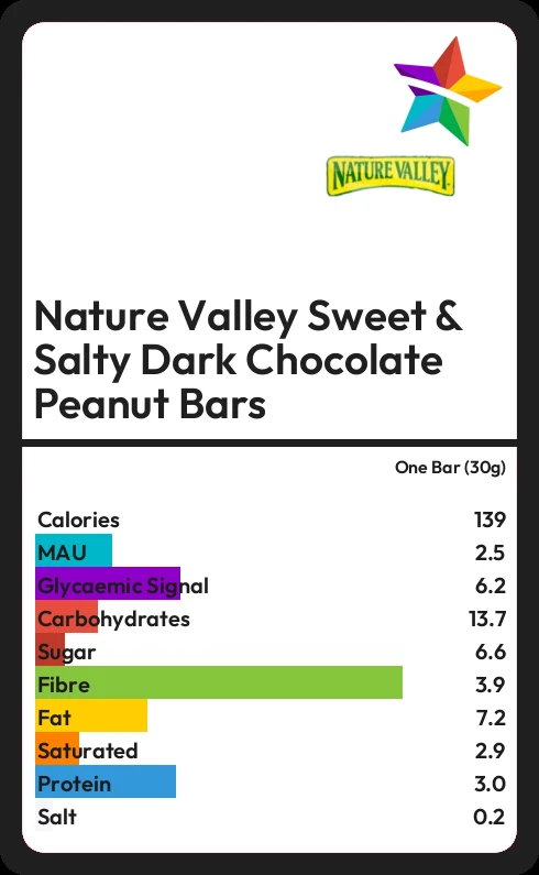 Nature Valley Sweet & Salty Dark Chocolate Peanut Bars contains 6.6g sugar in one Bar (30g) - that is around 2 cubes of sugar.