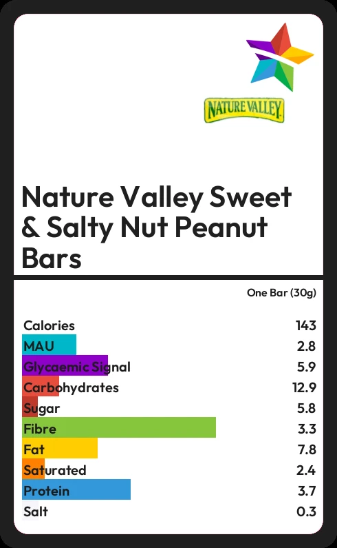 Nature Valley Sweet & Salty Nut Peanut Bars contains 5.8g sugar in one Bar (30g) - that is around 1 cube of sugar.