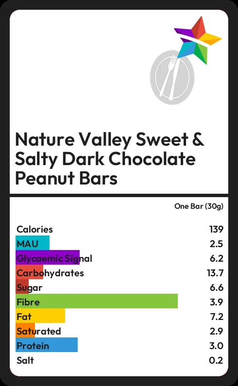 Nature Valley Sweet & Salty Dark Chocolate Peanut Bars contains 6.6g sugar in one Bar (30g) - that is around 2 cubes of sugar.