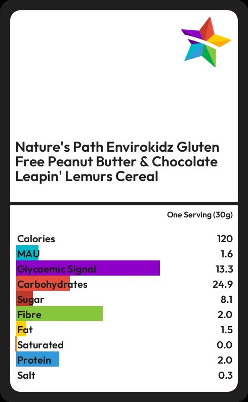 Nature's Path Envirokidz Gluten Free Peanut Butter & Chocolate Leapin' Lemurs Cereal contains 120 calories in one Serving (30g).