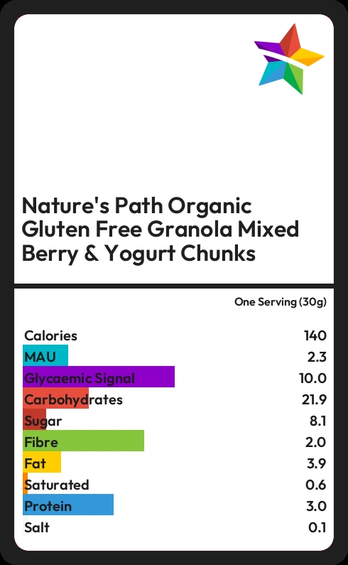 Nature's Path Organic Gluten Free Granola Mixed Berry & Yogurt Chunks contains 8.1g sugar in one Serving (30g) - that is around 2 cubes of sugar.