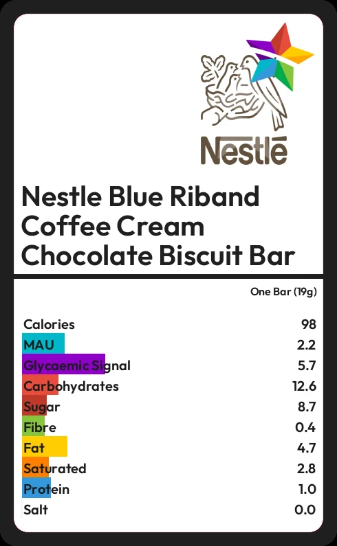 Nestle Blue Riband Coffee Cream Chocolate Biscuit Bar contains 8.7g sugar in one Bar (19g) - that is around 2 cubes of sugar.