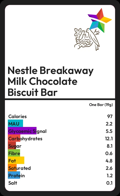 Nestle Breakaway Milk Chocolate Biscuit Bar contains 97.1 calories in one Bar (19g).