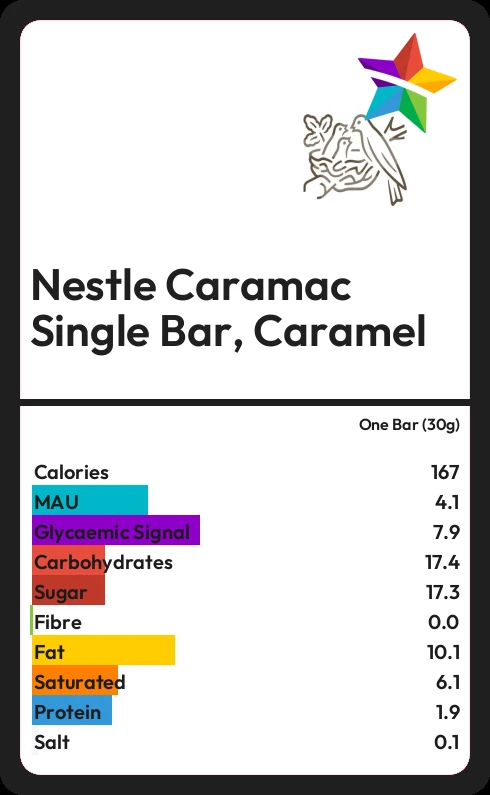 Nestle Caramac Single Bar, Caramel contains 17.3g sugar in one Bar (30g) - that is around 4 cubes of sugar.