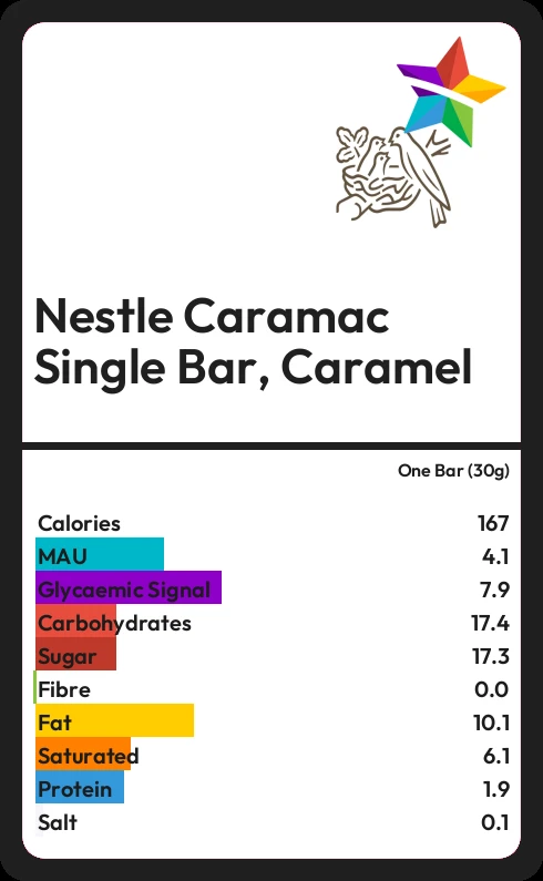 Nestle Caramac Single Bar, Caramel contains 17.3g sugar in one Bar (30g) - that is around 4 cubes of sugar.