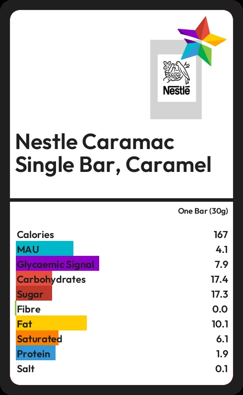 Nestle Caramac Single Bar, Caramel contains 167.4 calories in one Bar (30g).
