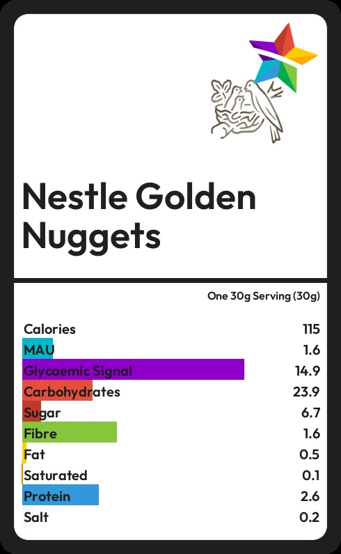 Nestle Golden Nuggets contains 6.7g sugar in one 30g Serving (30g) - that is around 2 cubes of sugar.