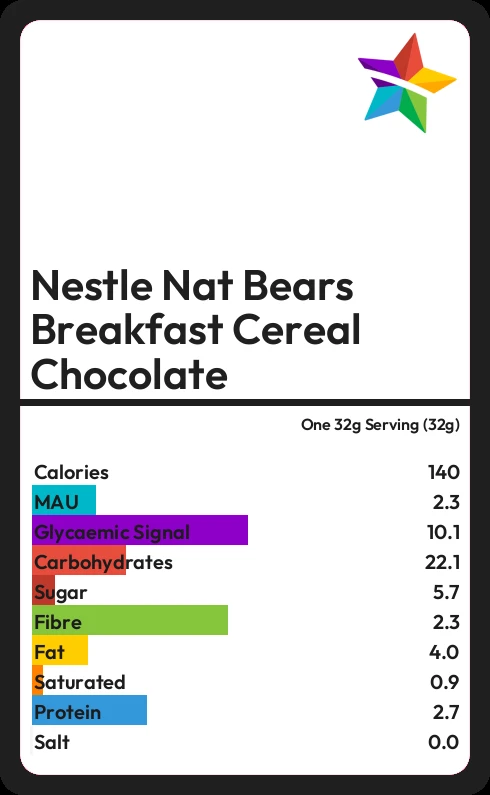 Nestle Nat Bears Breakfast Cereal Chocolate contains 140.2 calories in one 32g Serving (32g).