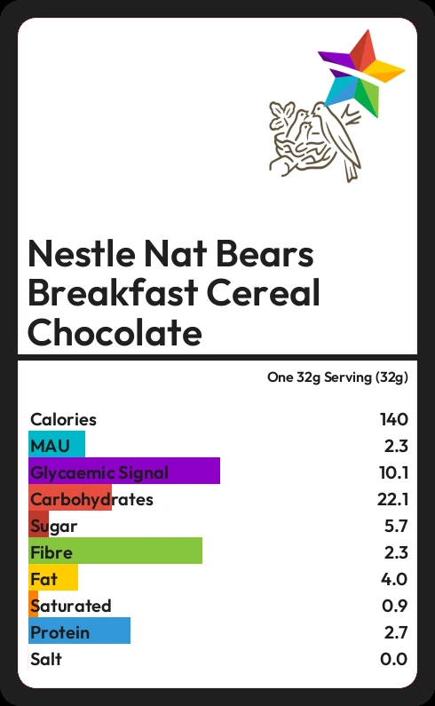 Nestle Nat Bears Breakfast Cereal Chocolate contains 140.2 calories in one 32g Serving (32g).