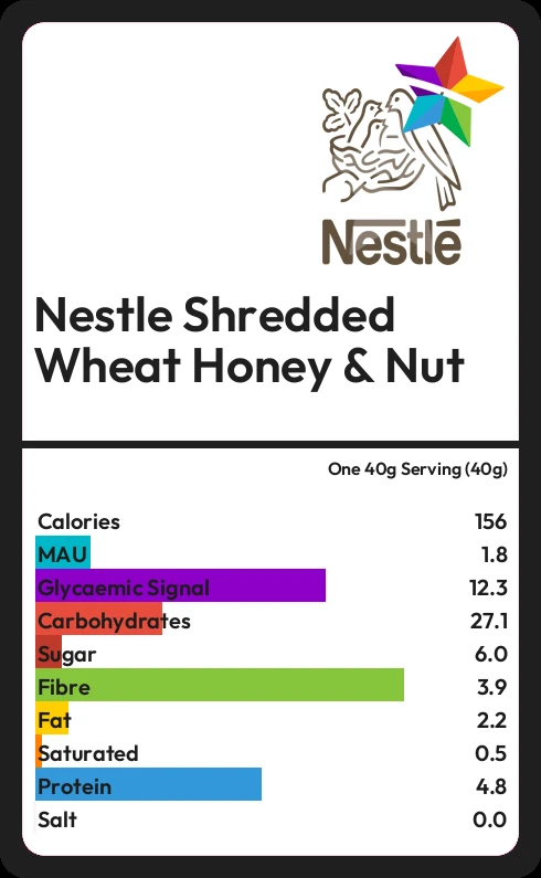 Nestle Shredded Wheat Honey & Nut contains 156 calories in one 40g Serving (40g).