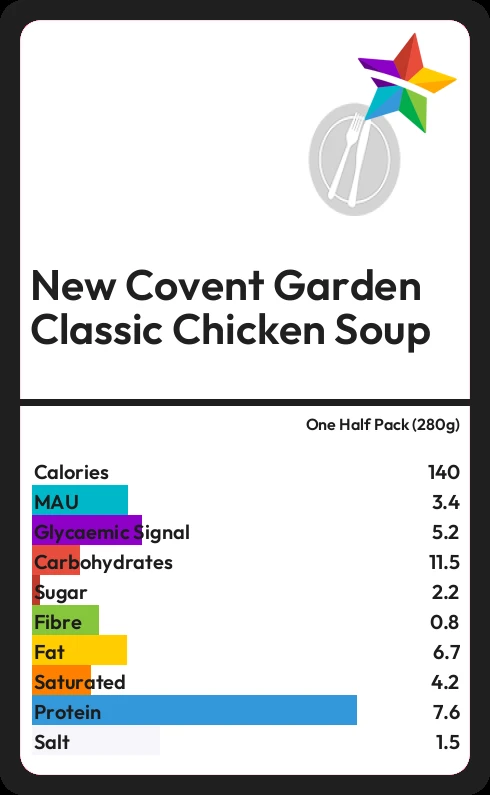 New Covent Garden Classic Chicken Soup contains 140 calories in one Half Pack (280g).