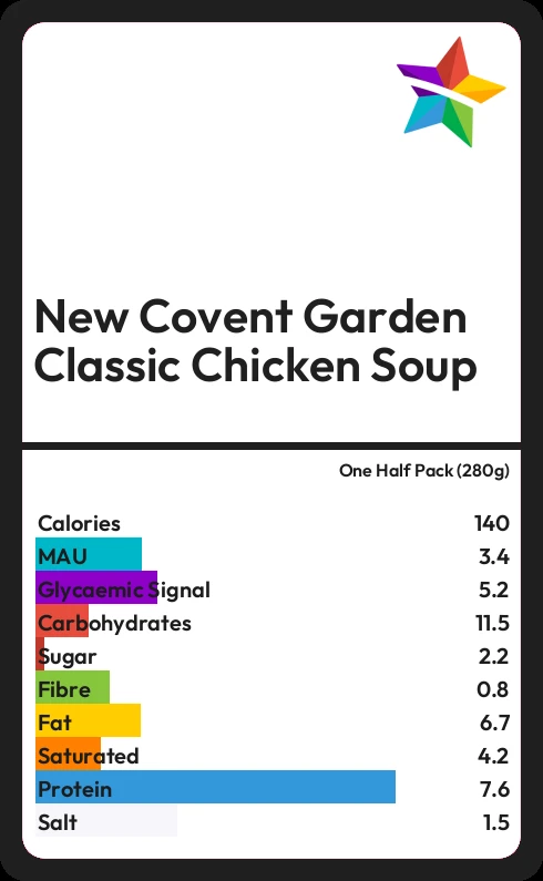 New Covent Garden Classic Chicken Soup contains 140 calories in one Half Pack (280g).