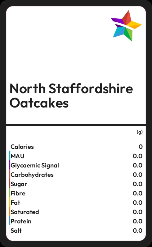 North Staffordshire Oatcakes contains 184 calories in 100g.