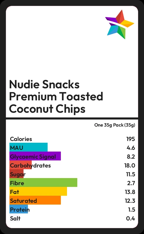 Nudie Snacks Premium Toasted Coconut Chips contains 11.5g sugar in one 35g Pack (35g) - that is around 3 cubes of sugar.