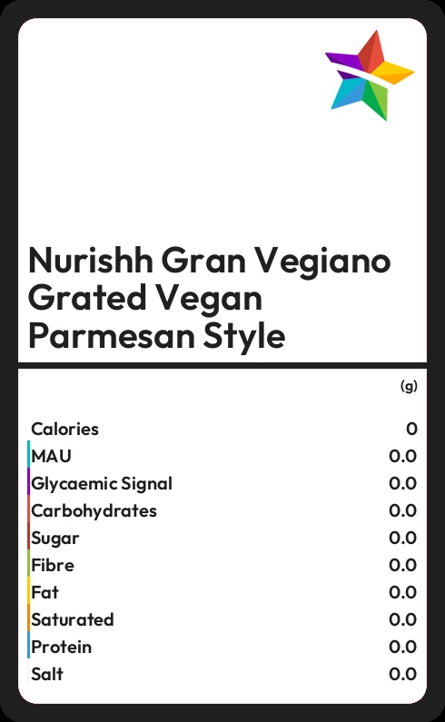 Nurishh Gran Vegiano Grated Vegan Parmesan Style contains 267 calories in 100g.