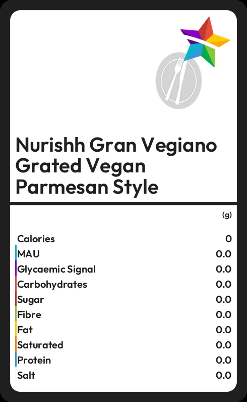 Nurishh Gran Vegiano Grated Vegan Parmesan Style contains 2.0g sugar in 100g - that is around 1 cube of sugar.